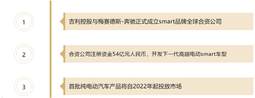 戴姆勒股份公司董事会主席兼梅赛德斯-奔驰股份公司董事会主席康林松(Ola Källenius)表示:经相关监管部门批准,我们与合作伙伴吉利控股共同筹备数月的合资公司现已蓄势待发。合资公司将在中国及全球市场推出下一代零排放smart电动车型。我们期待双方继续紧密合作,将优秀的产品与服务带给全球客户。