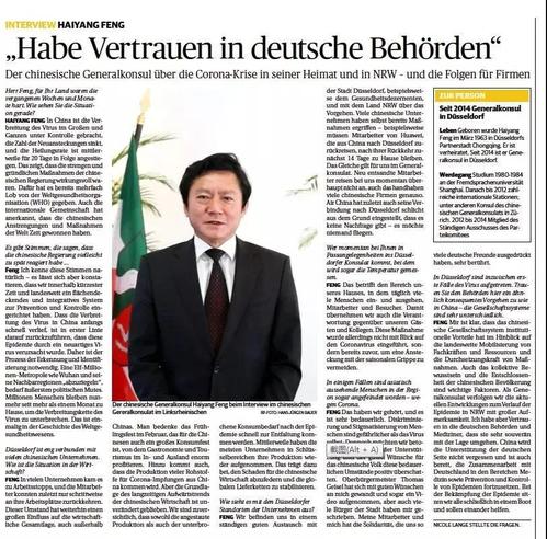 近来,新冠肺炎疫情在德国呈现多点暴发和扩散态势,北威州确诊病例数量居全德首位。如何看待中国与北威州战“疫”?双方如何共克时艰?3月10日,德国西部地区最大和最具影响力主流媒体之一《莱茵邮报》(Rheinische Post)刊登对中国驻杜塞尔多夫总领事冯海阳的专访。采访全文及中文参考译文如下: