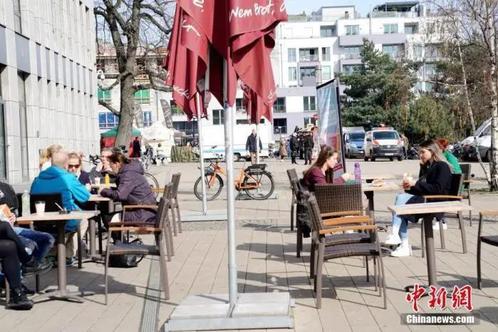 当地时间3月18日中午,柏林市中心一家面包房外,市民在晒太阳。中新社记者 彭大伟 摄